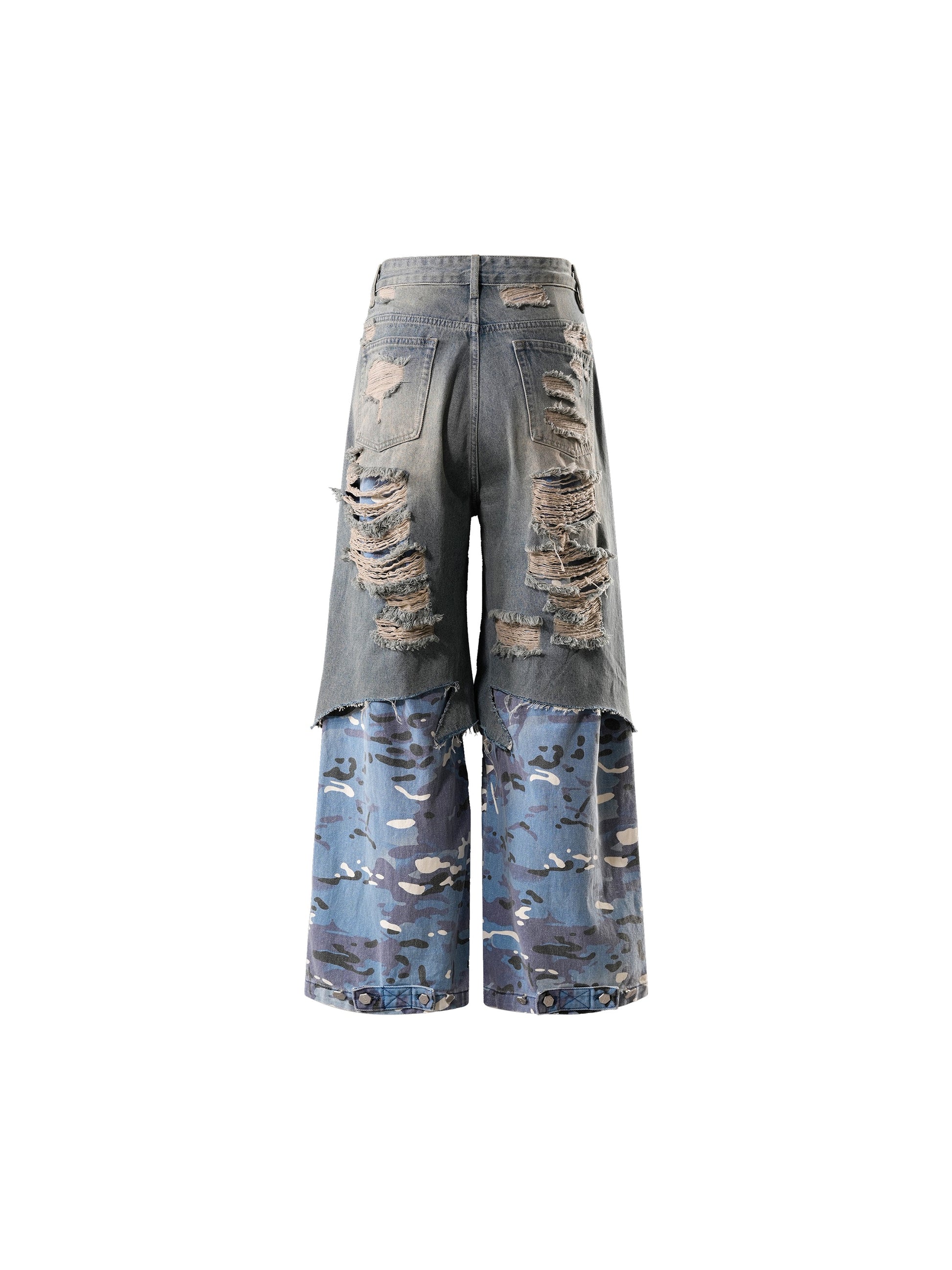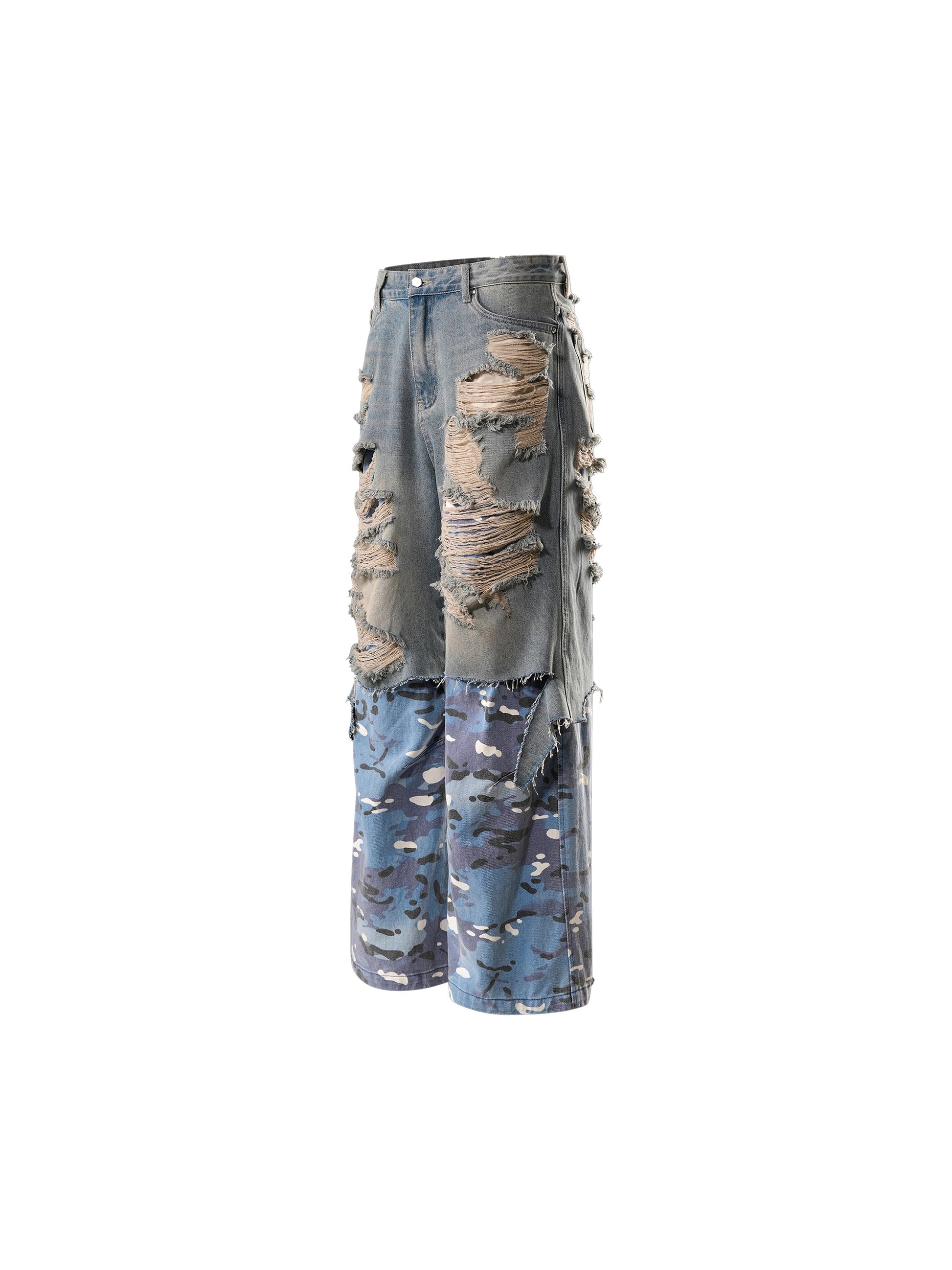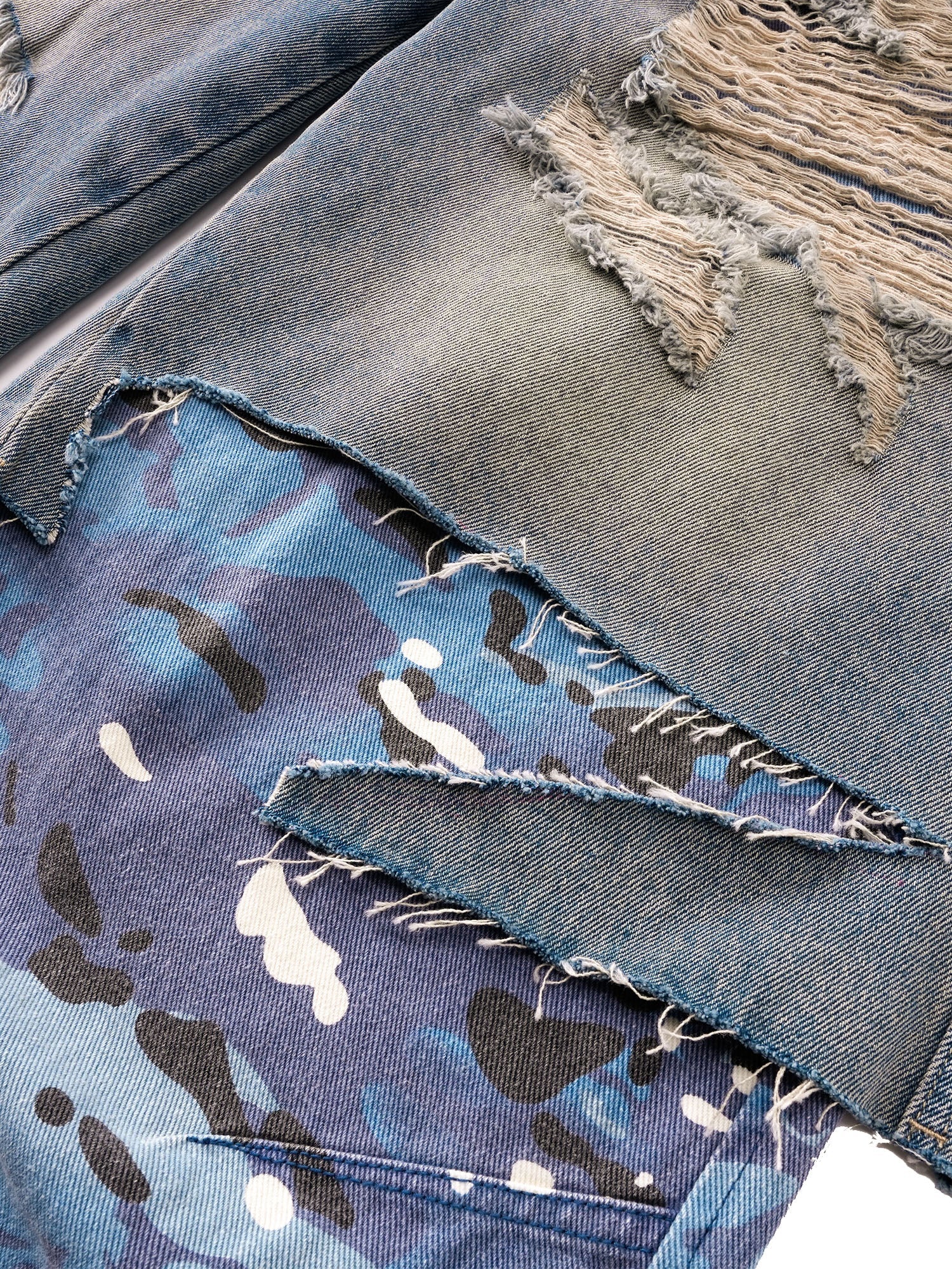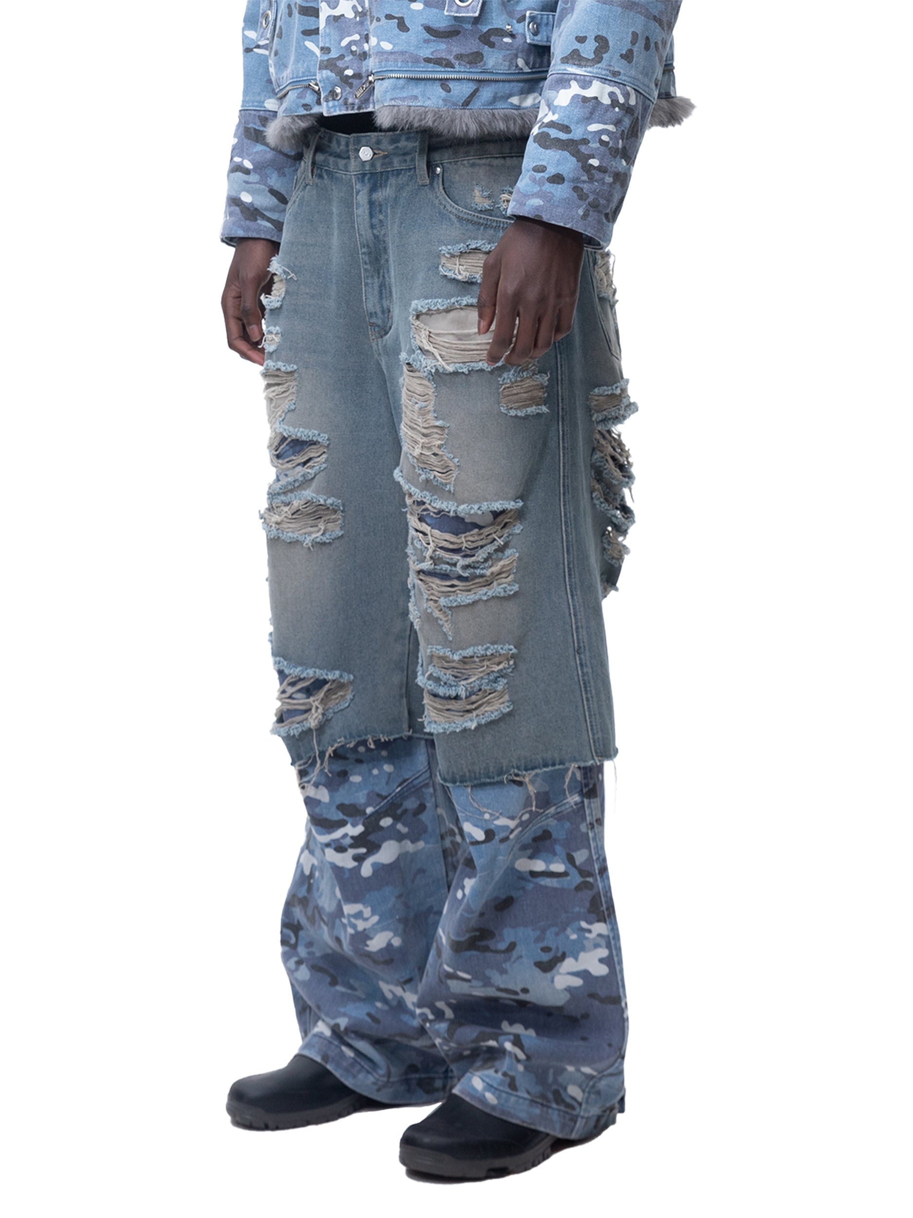 ECLIPSE OF THE BLOOD MOON DISTRESSED DENIM BLUE CAMOUFLAGE LAYERED PANTS