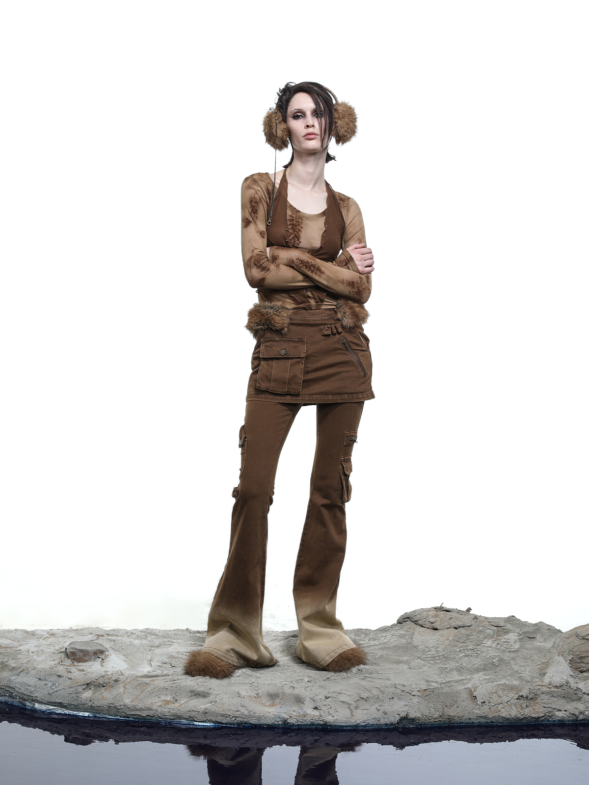 The FADE WASH FLARED SKIRT+JEANS features a mini denim skirt paired with flared jeans, accented by a stylish fade wash at the pant ends. This edgy combination delivers a cool, modern look that blends classic denim with a fresh twist, perfect for effortless street style.